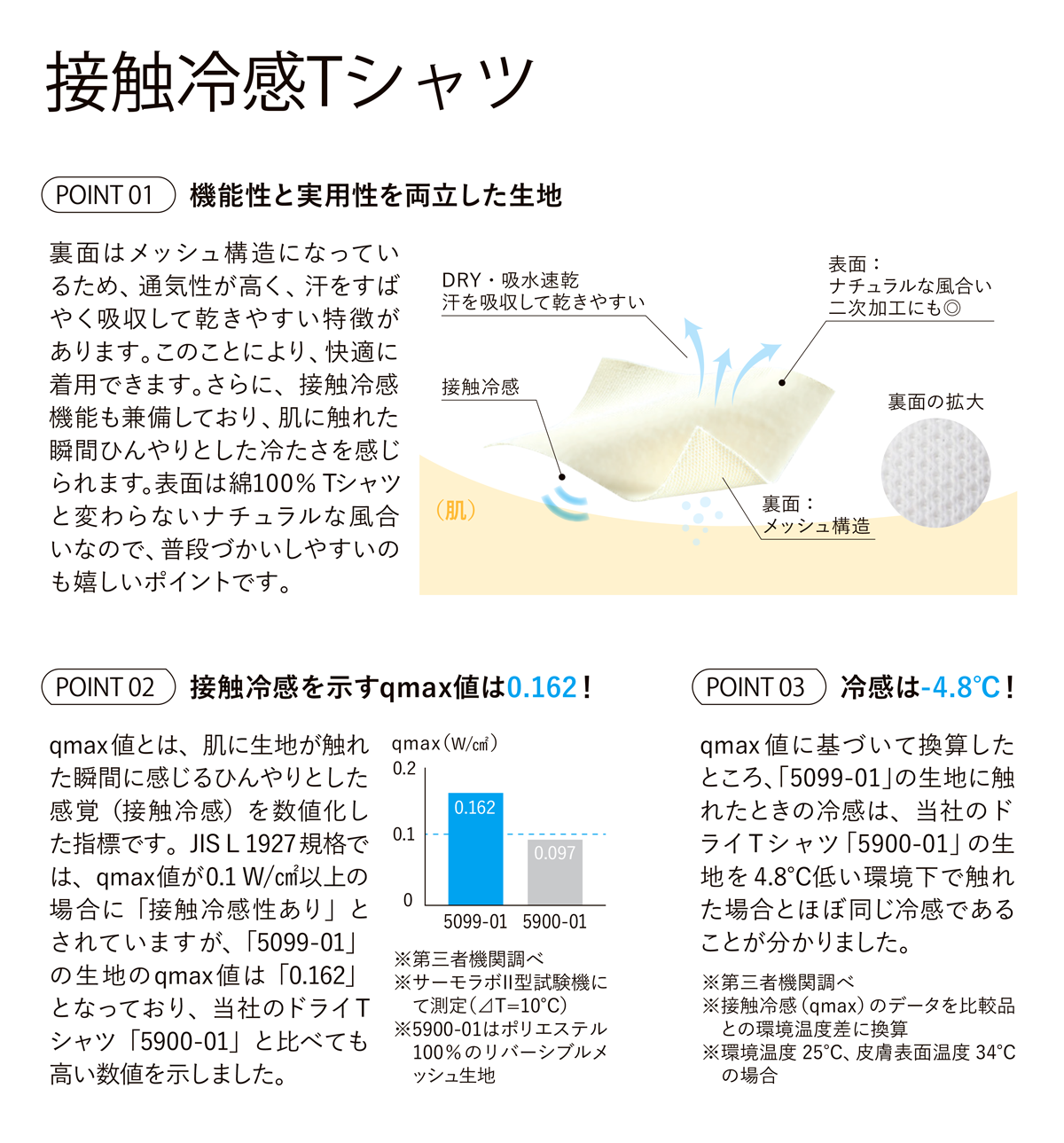 猛暑の熱中症対策に。DRY×接触冷感機能を兼備したシティウェア綿とナイロンの交編によるダブルフェイス地を採用し、ナイロンが持つ冷感と特殊な加工によって肌に触れた瞬間ひんやりとした冷たさを感じられる質感に。街着として日常的に着ることができるよう、表糸に綿糸を使用することでナイロン特有の光沢感をおさえ、綿100%Tシャツのようなナチュラルな風合い。裏地はメッシュ構造で肌離れが良く、汗を吸収し拡散する“吸水速乾性”。