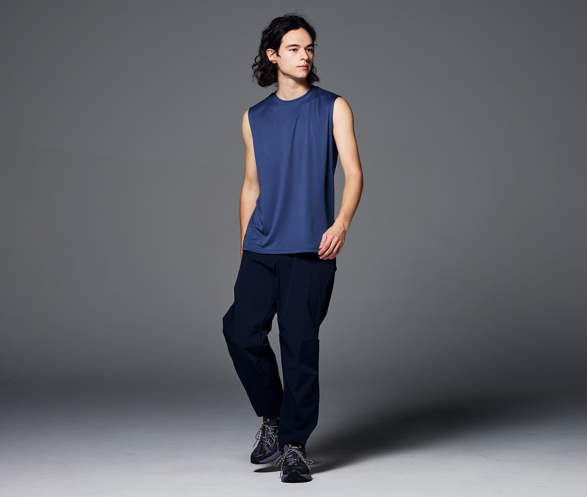 リサイクルポリエステルを採用し環境への負荷を軽減しながら、吸水速乾性とUVケアも兼備した注目の一枚。スムース編みによる伸縮性とやわらかでなめらかな風合いが、洗練された印象を与えるスリーブレスシャツです。袖がないことで、通気性に優れ体を動かしやすいというメリットのあるスリーブレスタイプは、スポーツシーンでの着用におすすめ。生地表面は、セミダル糸を使用したことによりテカリを抑えた自然な光沢感です。スポーティーすぎず、デイリーユースにもなじむ質感で、ワードローブの新定番に◎。また、同生地シリーズで複数スタイルを展開。シーンやスタイルに合わせたさまざまな提案を可能にします。