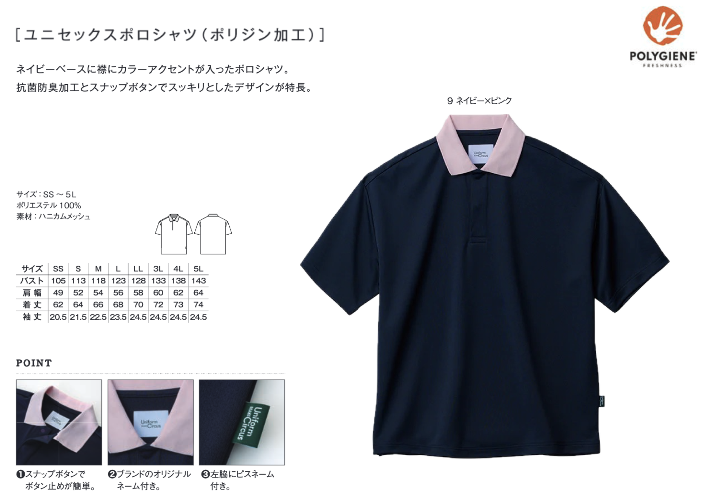 快適なハニカムメッシュ: 吸水速乾性に優れ、ストレッチ性のあるポリエステル100%素材を使用。介護や医療などの忙しい現場でも快適です。