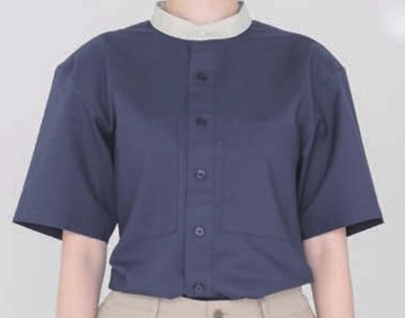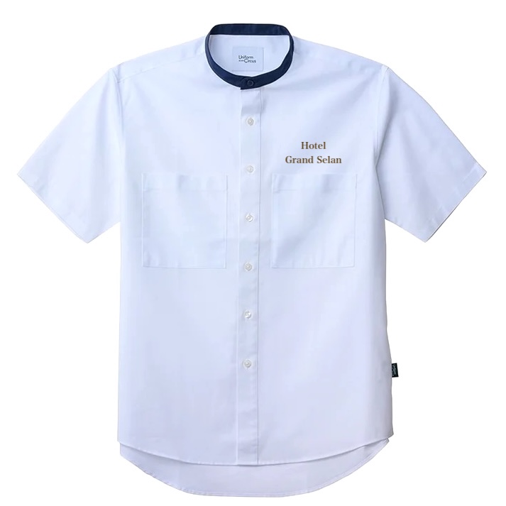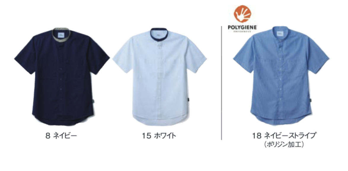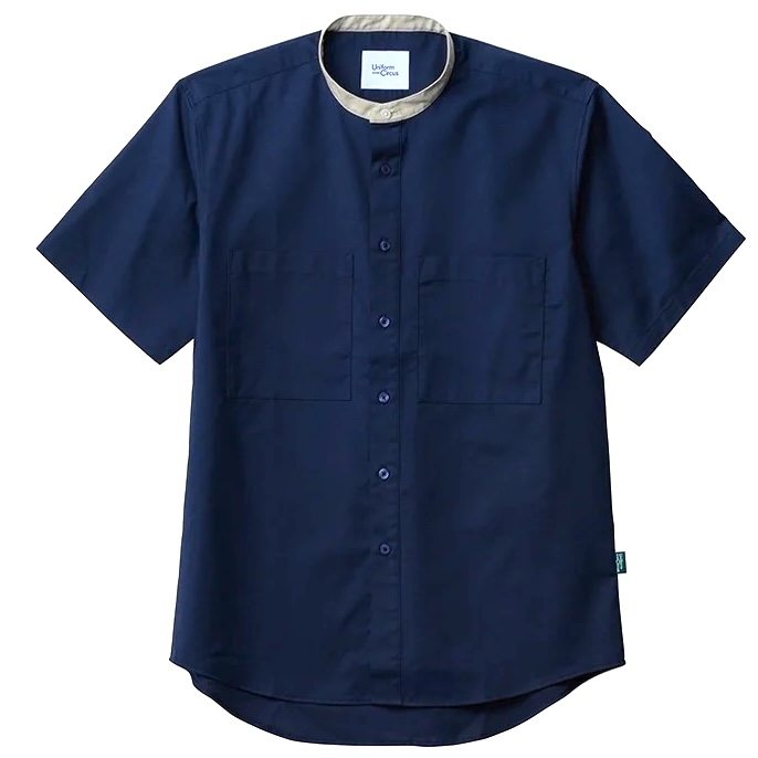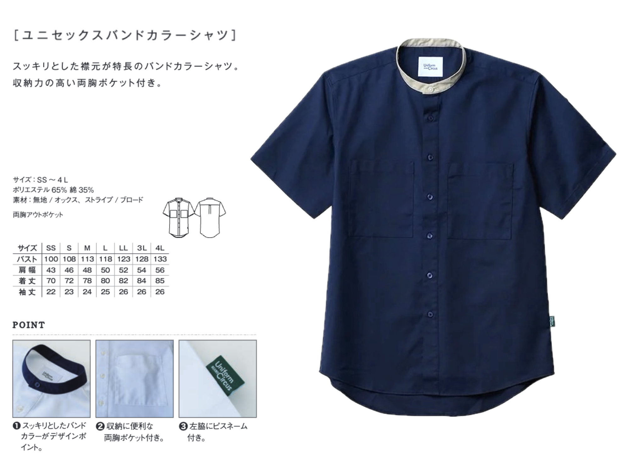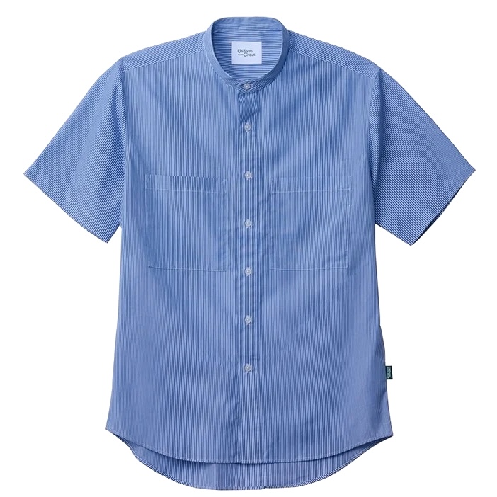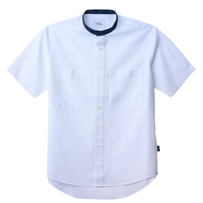 プロフェッショナルなシーンでも、デイリーユースでも馴染むスッキリとしたデザインが特徴です。首元を圧迫しないバンドカラー(立ち襟)が、清潔感と程よい抜け感を演出します。