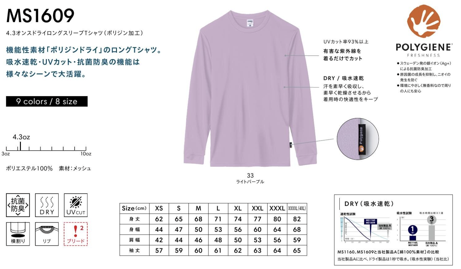 4.3オンス ドライロングスリーブTシャツ(ポリジン加工):MS1609