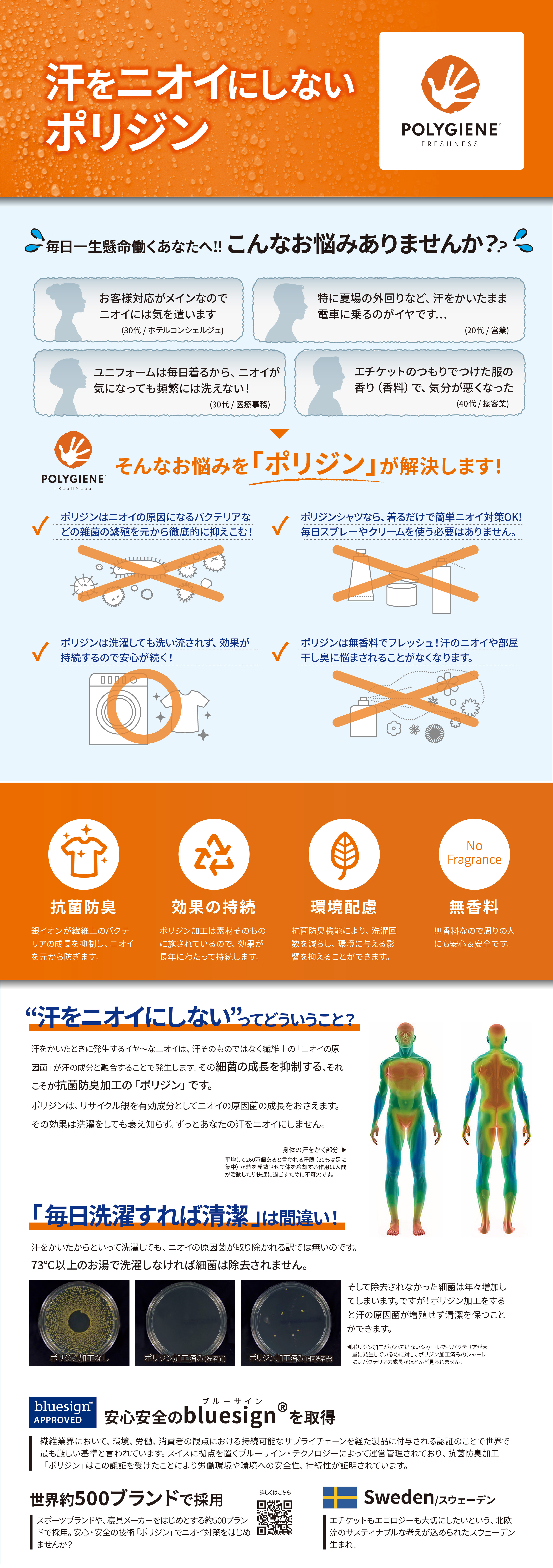 ポリジン(Polygiene)加工: 銀イオン(Ag+)による抗菌防臭技術。繊維上のバクテリアの成長を抑制し、嫌なニオイを元から防ぎます。