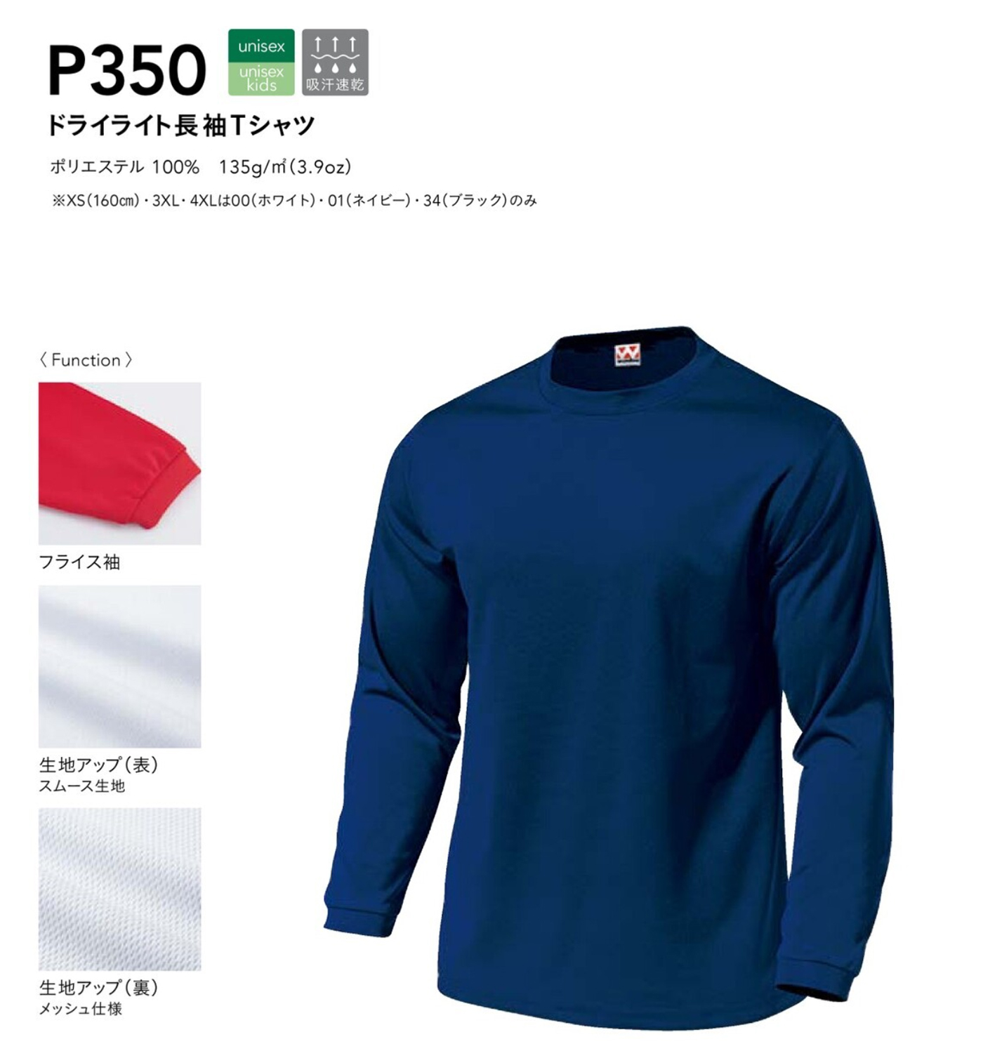 ※XS・3XL・4XLは00(ホワイト)・01(ネイビー)・34(ブラック)のみの展開となります。