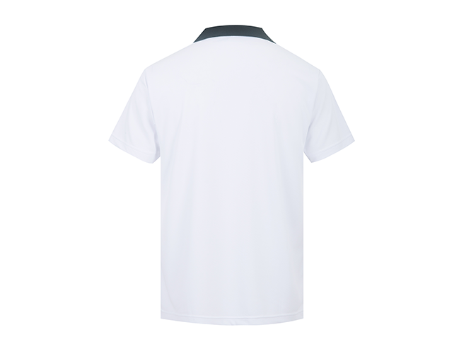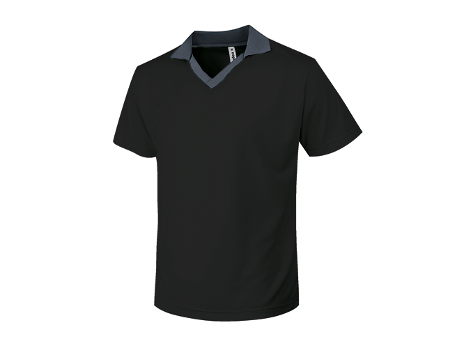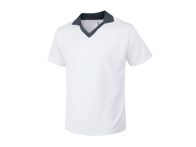 襟元の配色がアクセントになった、コントラストVネックタイプのゲームシャツ。