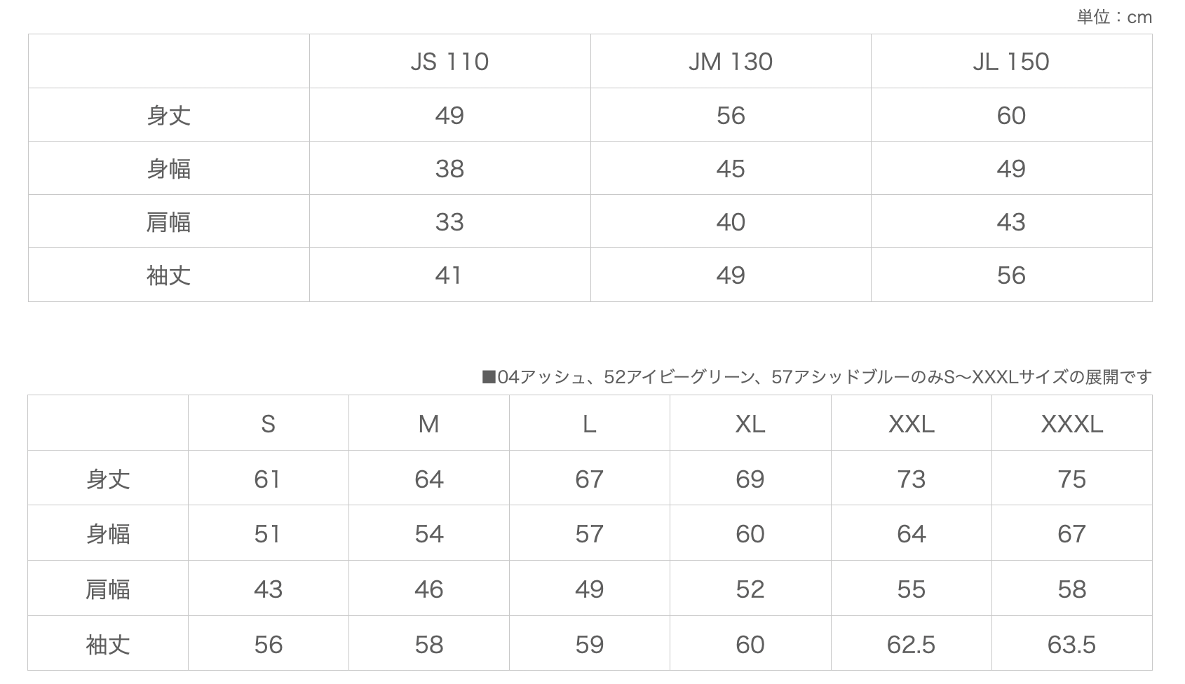 ※04アッシュ、52アイビーグリーン、57アシッドブルーは、S〜XXXLサイズの展開です