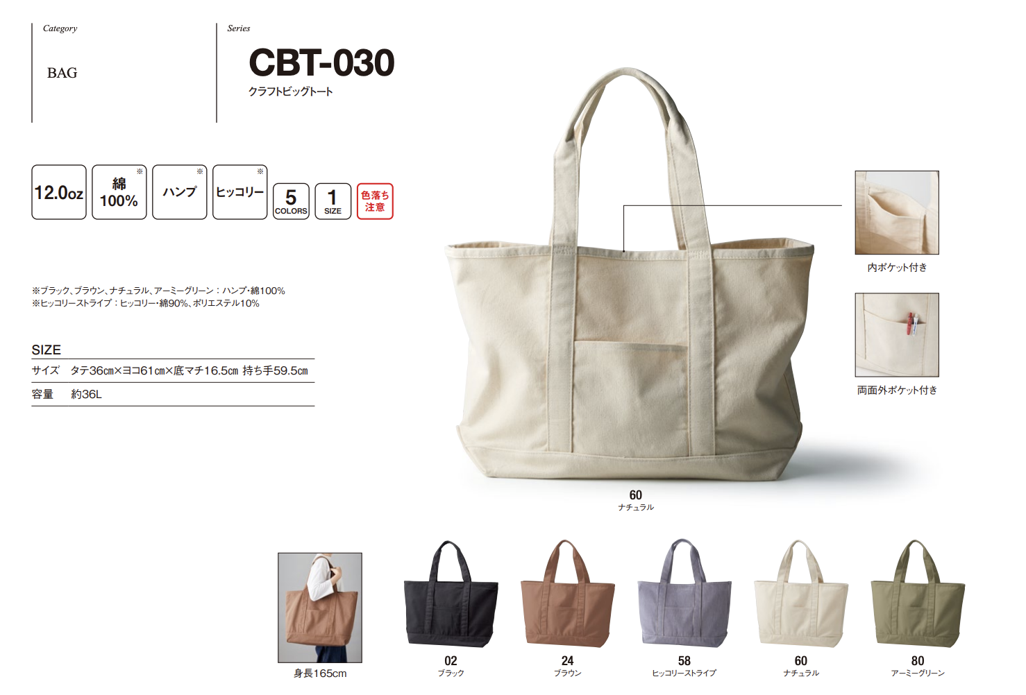 ※ブラック、ブラウン、ナチュラル、アーミーグリーン : ハンプ・綿100%